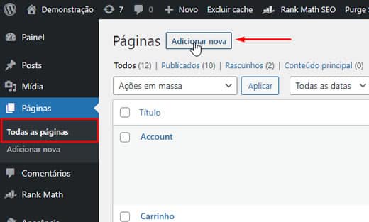 Vamos criar uma nova página em Páginas » Adicionar nova para nosso feed.
