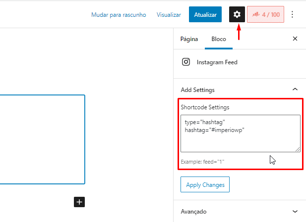 Se você estiver usando o bloco de feed do Instagram no editor visual do WordPress, não precisa criar o shortcode inteiro. Você pode simplesmente adicionar suas configurações de shortcode nas configurações do bloco de feed do instagram: