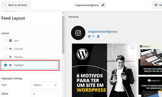 Para alterar o Layout, basta clicar na guia Feed Layout destacada na imagem acima. Vamos usar um layout de Highlight para nossas fotos do Instagram, com cada 3 fotos em destaque.