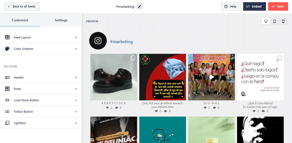 Agora basta você esperar alguns segundos para carregar o seu feed de hashtag. A partir daqui você pode personaliza-lo. São se esqueça de salvar as alterações clicando no botão “SAVE” no canto superior direito para salvar o seu feed.