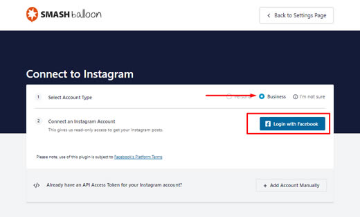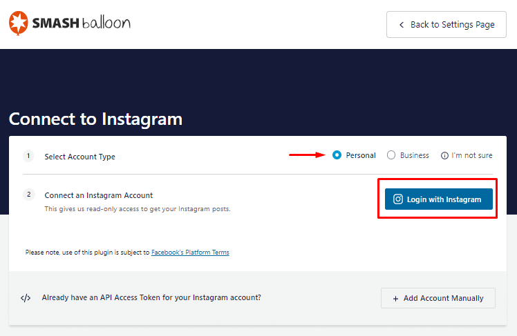 Em seguida, você verá uma página solicitando que você escolha o seu tipo de perfil, perfil pessoal ou empresarial do Instagram, depois de selecionar seu tipo de perfil clique no botão “Login with Instagram”.