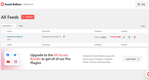 Para alterar a aparência do seu feed do Instagram, vá para Instagram Feed » All Feeds. Nessa página você terá acesso a lista de feeds do Instagram que você criou no WordPress. Clique no botão editar indicado pela seta abaixo:
