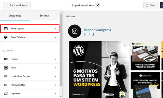 Aqui, você pode alterar a largura e a altura do seu feed, alterar o layout, alterar o número de fotos, colunas e muito mais.