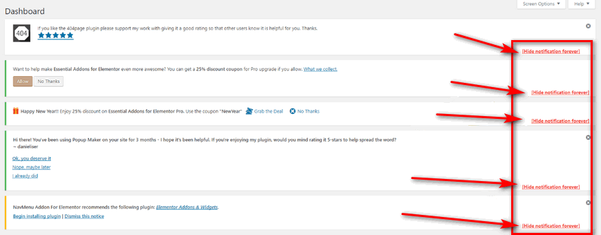 Este plugin adiciona uma opção “Ocultar notificação para sempre” abaixo de cada aviso no Painel. Ao clicar neste link, você nunca mais verá a notificação. Você pode usar esse método para desativar apenas os avisos irritantes que continuam aparecendo na página inicial e deixar o WordPress continuar exibindo os avisos importantes, como atualizações.