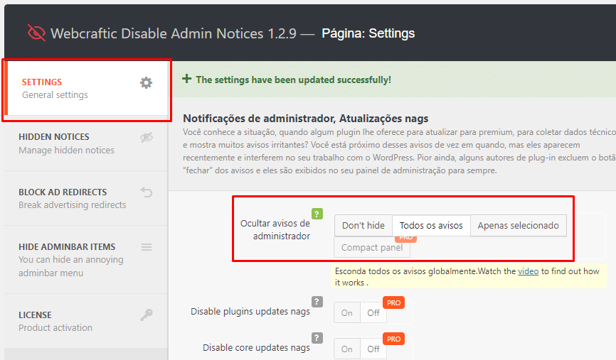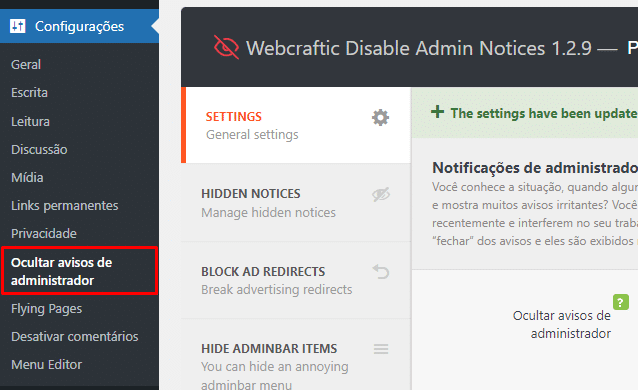 Além disso, nas configurações, você pode definir o plugin para desativar completamente todos os avisos em todo o site. Nesse caso, o plugin remove os avisos da administração do WordPress e mantém os avisos de atualização importantes.