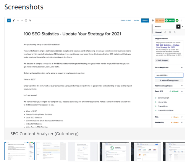 Para a maioria dos plugins do WordPress no diretório, você verá uma seção de capturas de tela abaixo da descrição do plugin. Capturas de tela de plugins são uma maneira rápida de ver como o plugin aparece no front-end e no back-end do seu site WordPress.