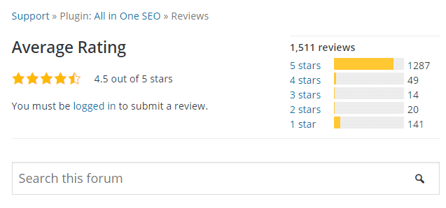 Na barra lateral da página do plugin, você também poderá ver a classificação do plugin. O número de estrelas indica pontuação de classificação, onde cinco é o mais alto e um é o mais baixo.