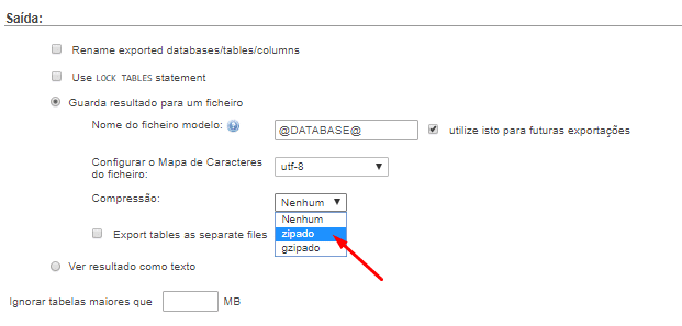 Role para baixo até a seção de saída. Por padrão, o phpMyAdmin mostrará a saída do processo de exportação como texto. Você precisa mudar isso selecionando a opção “Salvar saída em um arquivo” ou “Guarda resultado para um ficheiro”. Para compactação, você precisa selecionar a opção zipada ou gzipada.