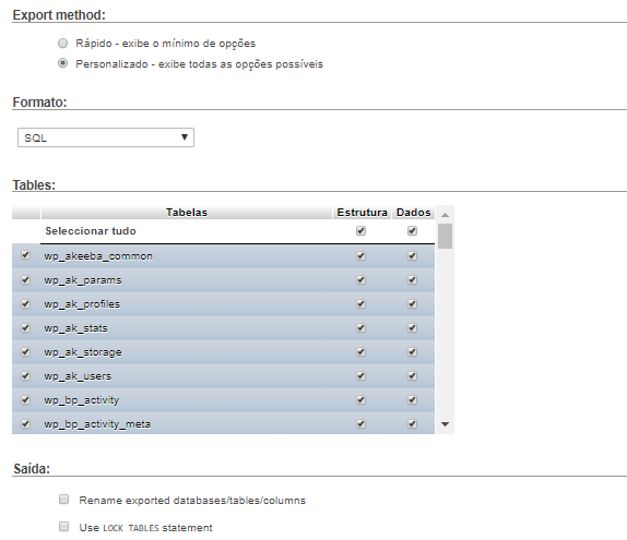 Às vezes os plugins do WordPress adicionam suas próprias tabelas ao seu banco de dados. Se houver alguma tabela que você gostaria de excluir da exportação, poderá desmarcá-las. Se você não tiver certeza, é melhor manter todas selecionadas.