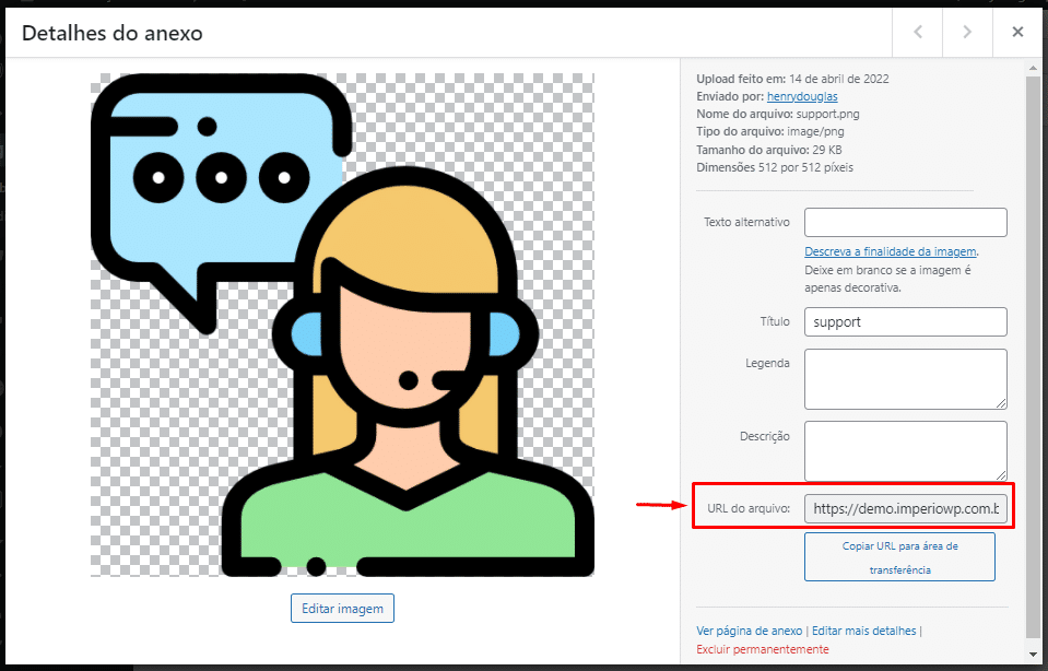 Por exemplo, uma imagem chamada “support.png” enviada para siteexemplo.com.br em abril de 2022 terá uma URL como este: