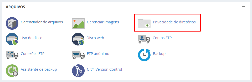 Faça login no seu cPanel. Role para baixo até ver a seção Arquivos. Clique no ícone “Privacidade de diretórios”.