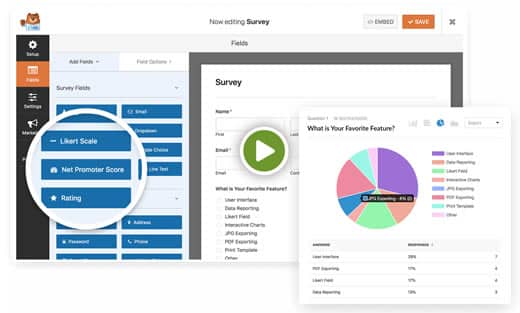 O WPForms permite adicionar qualquer campo de formulário à sua pesquisa com um clique de um botão, incluindo campo de texto, caixas de seleção, botões de opção, classificações, escala Likert, campo de pontuação NPS e muito mais.