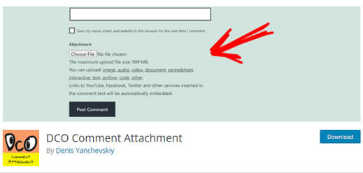 DCO Comment Attachment permite adicionar um campo de anexo de arquivo ao seu formulário de comentários do WordPress, que permite aos usuários fazer upload de imagens e outros arquivos com seus comentários.